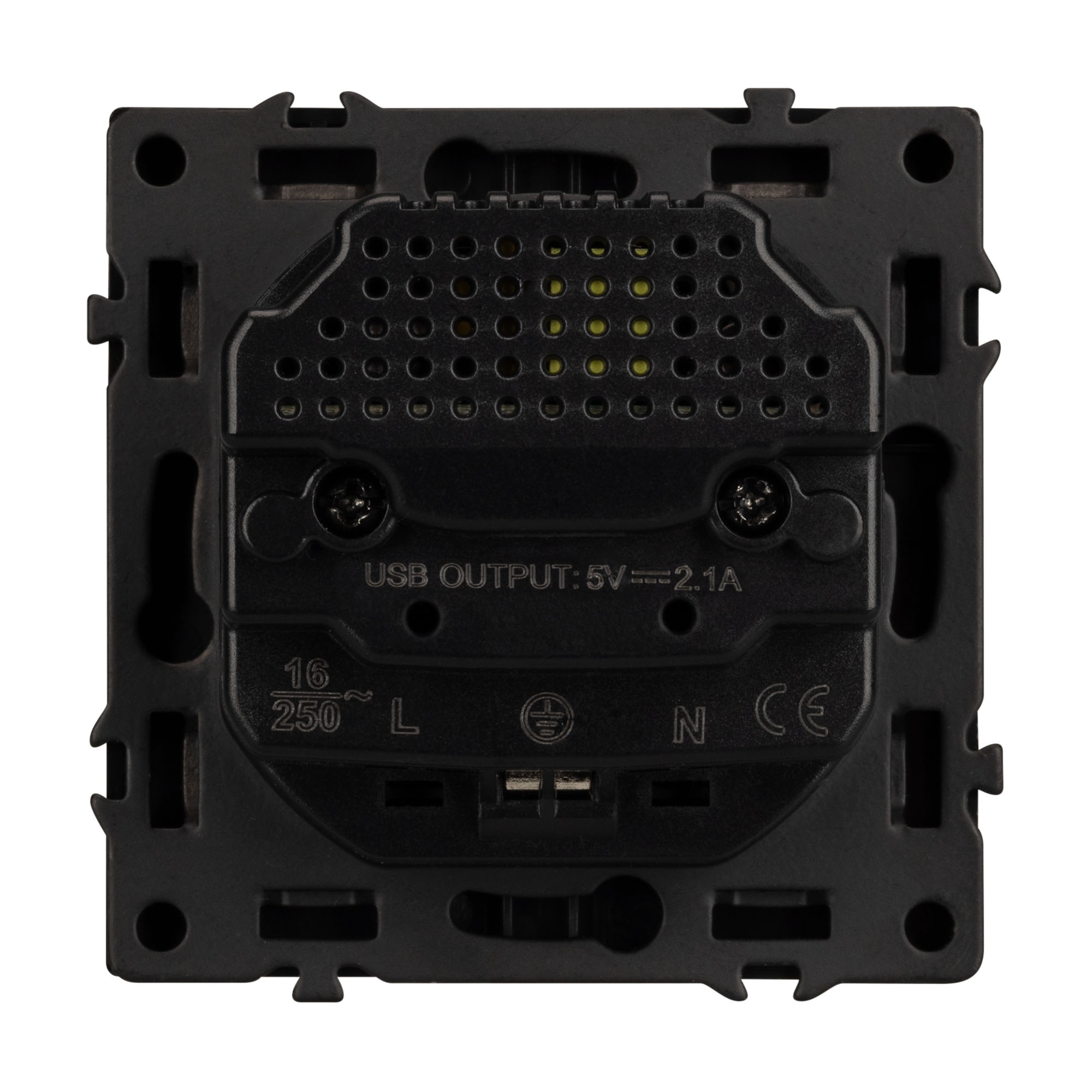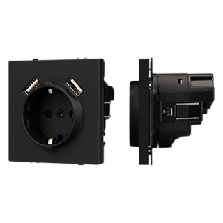 Механизм розетки с заземлением на 1 пост и 2USB Type A порта. Цвет - черный, с Soft-Touch покрытием. Без фронтальной рамки. Уровень пылевлагозащиты IP20. Розетка устанавливается в стандартный подрозетник круглого сечения диаметром 60мм.