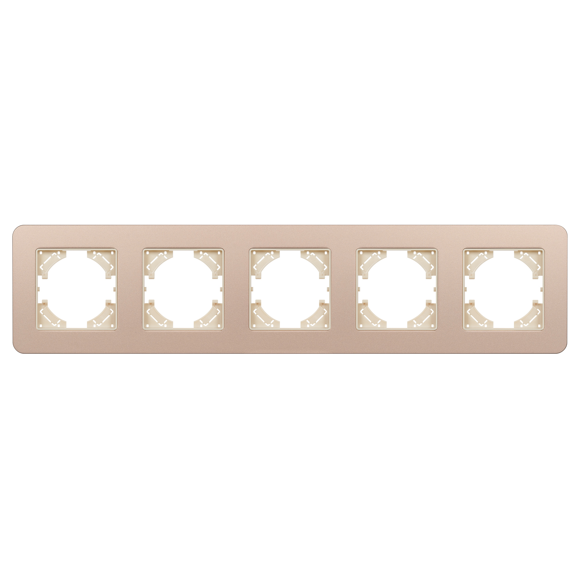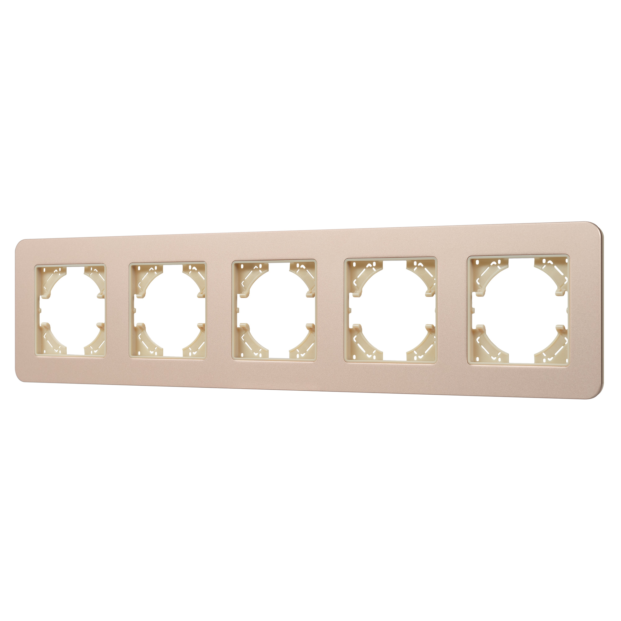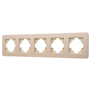 Рамка алюминиевая на 5 постов, под встраиваемый механизм. Цвет - золотой с Soft-Touch покрытием. Среднего уровня герметичности IP20. Ориентация монтажа - горизонтальная (основным ориентиром служат посадочные выступы для накладки механизма).